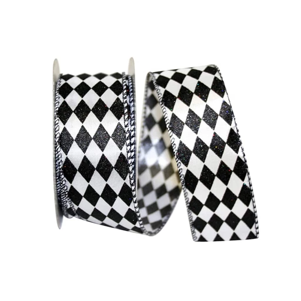 This black and white harlequin printed ribbon is the perfect way to add bold color and texture to any project. Perfect for gift wrapping, baskets, wreaths and more! The wired edge helps your bows keep their shape.