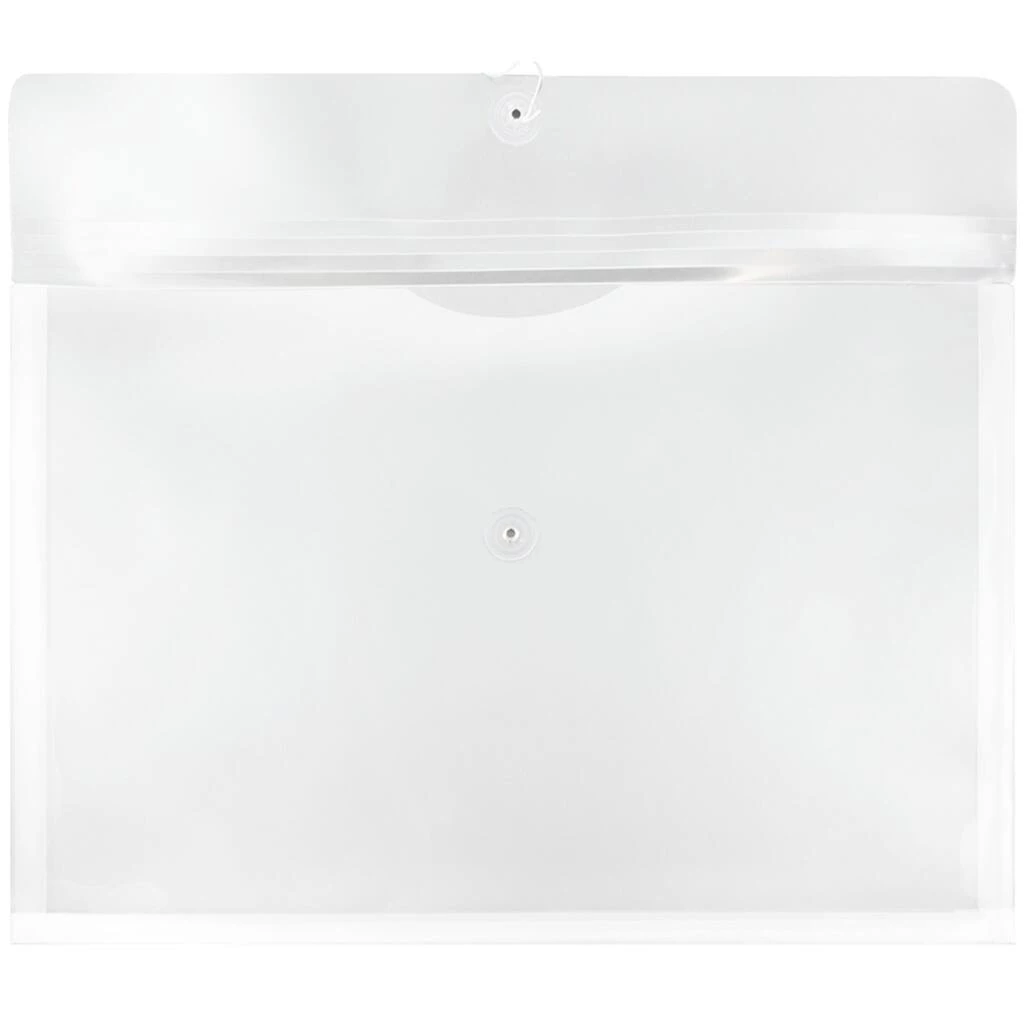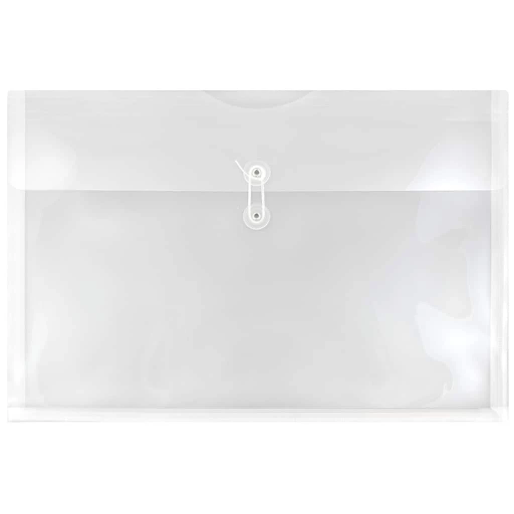 JAM Paper Clear Large Booklet Plastic Envelopes with Button and String Tie Closures are perfect for keeping all of your larger important documents safe and organized. Whether it be financial reports for the office, the records of your employees, or drawings that you are submitting for art class, this envelope can reliably and conveniently protect them all. Each one is made of a durable, flexible plastic and features a straight flap opening. As the name implies, each closes with a secure two button string tie closure. Use them at home, work, or school. With 12″ x 18″ of inner space, these envelopes even provide enough room for those larger than average documents that you may need for presentations. This pack comes with 12 envelopes.