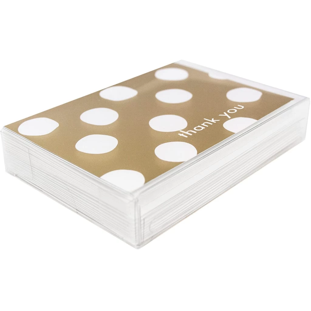 Delight recipients with JAM Paper Blank Thank You Card Sets! This simple yet chic Gold Polka Dot Thank You Card Set greets loved ones immediately with the words ‘thank you’, letting them know what’s in store! Flip open the foldover cards to write a sweet, funny, or sentimental message in the blank space provided inside. Use this set for any occasion during any time of year, as gold and white are the perfect color combination. Your recipients will be thrilled to receive your gratitude and love! This pack includes 10 white cards and 10 matching V-Flap envelopes. Each card measures 3 1/2″ x 4 7/8″ and has a shiny finish.