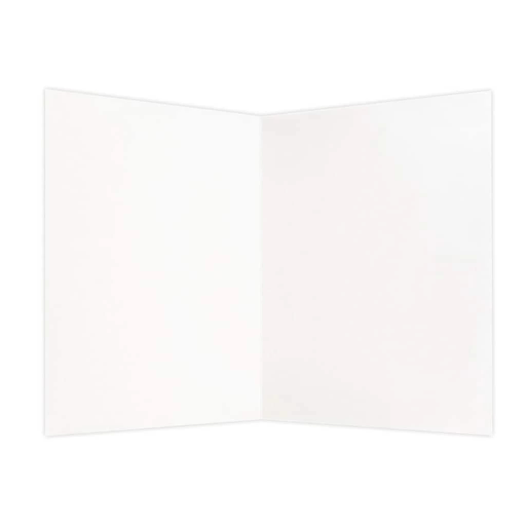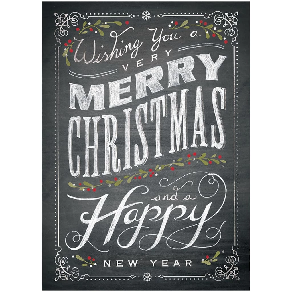 On the front cover, these cards have a stylized chalkboard image that reads “Wishing You a Very Merry Christmas and a Happy New Year” in white, faux chalk lettering. There are minimalistic green and white holly accents around the lettering and thin, elegant white border around the outside. Each card is blank on the inside so that you may include any message you would like to send to your recipients this Christmas season. The accompanying envelopes are a pure, snowy white color.Β
