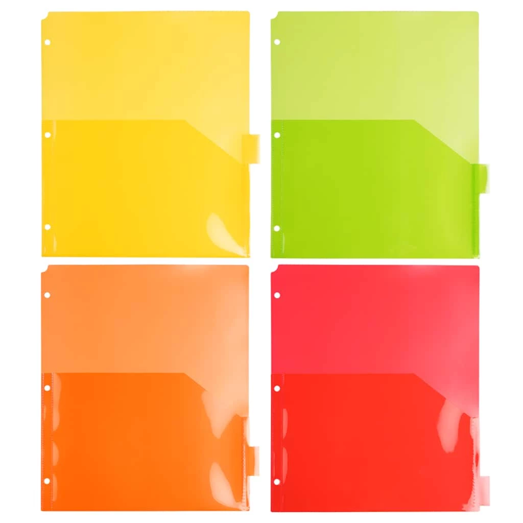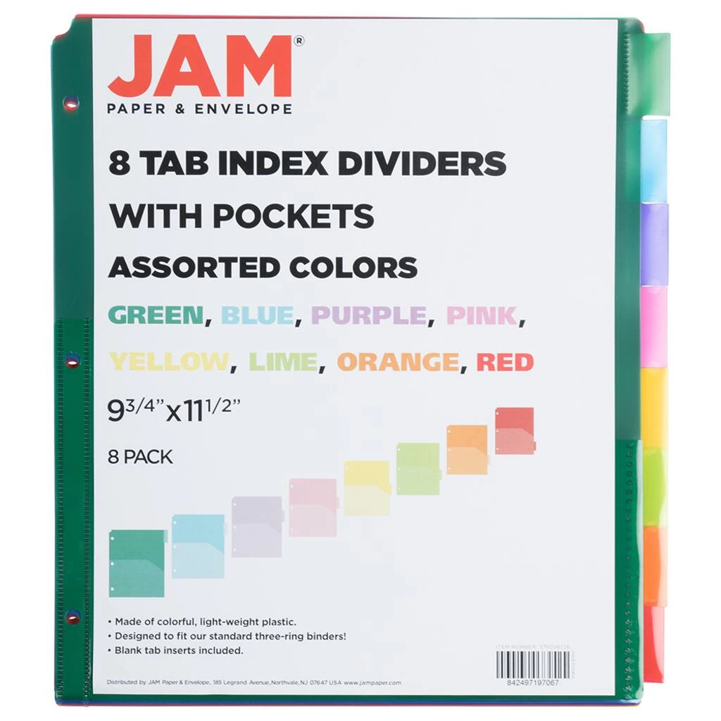 Each divider in this set features a clear plastic pack that spans the bottom half to help you neatly sort and organize documents. The left side of each divider features three holes designed to allow you to secure them into 3-ring binders. On the right side edge, each one has a clear plastic tab that matches the color of each divider. There are 8 dividers in this set, each featuring a different color. Included colors are blue, green, purple, yellow, and pink. Use these dividers for school or your office!Β
