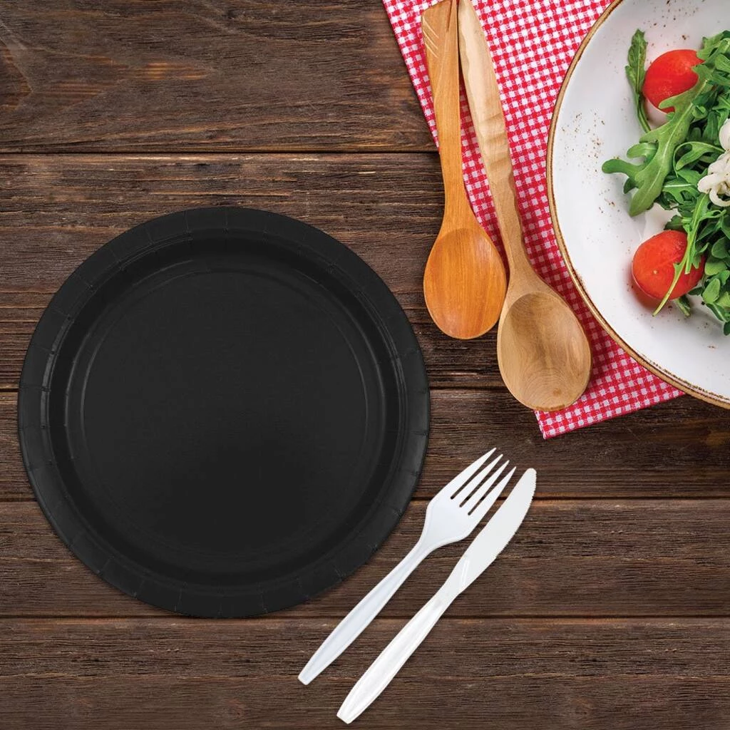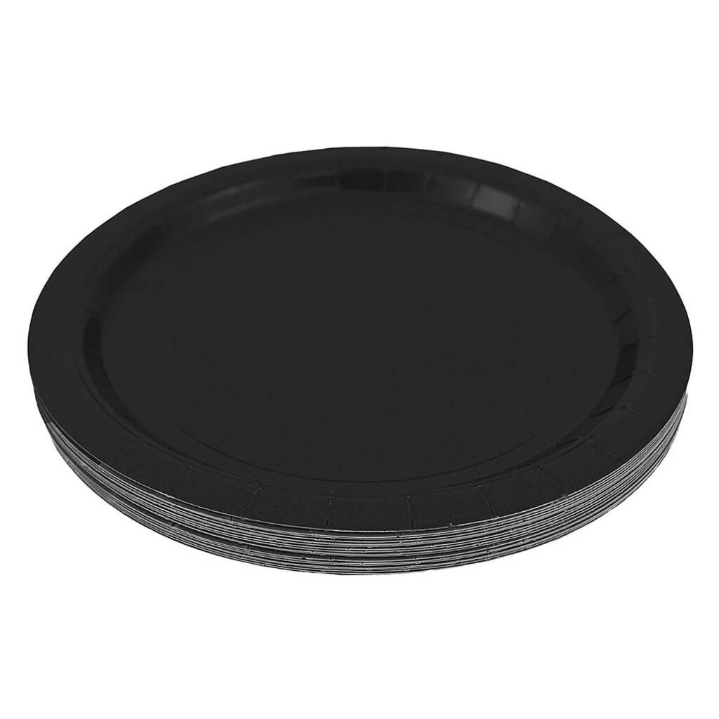 These paper plates are a must-have for your next event! Use these black plates for various occasions such as graduation parties, barbeques, birthdays, and more when you want to match your theme and cut out clean up time. Made from sturdy, durable cardstock with a smooth food safe finish, your food stays put while cancelling out the worry of leaks and tears. Once your event is over, kick back and relax as no washing of dishes is required!