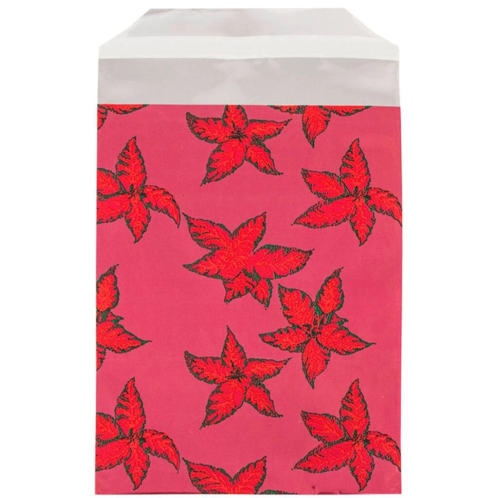 Made out of light weight and durable plastic based foil material and feature a shining, festive red color with a pattern of bright red poinsettia flower bordered and detailed in green. Each one has a reliable self adhesive peel-and-seal closure to the contents placed inside secure. Use these Holiday themed envelopes to enclose letters, Christmas cards, small gifts, and more. Their shiny appearance is sure to help make your holiday season merry and bright!Β