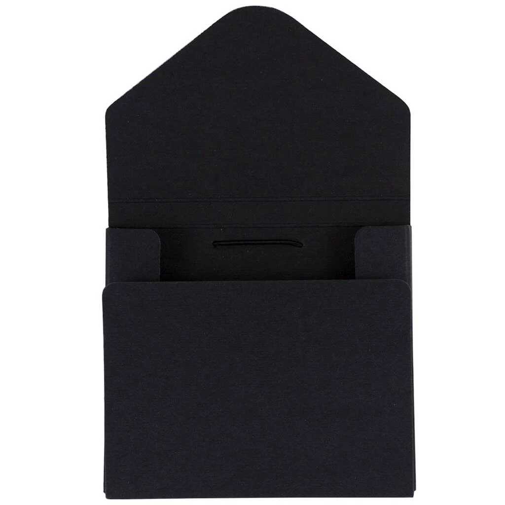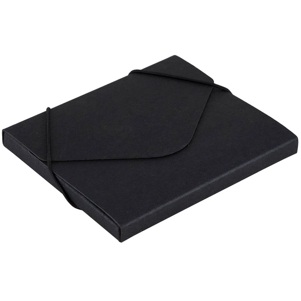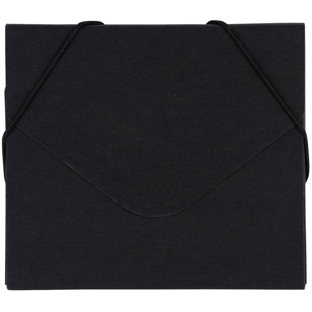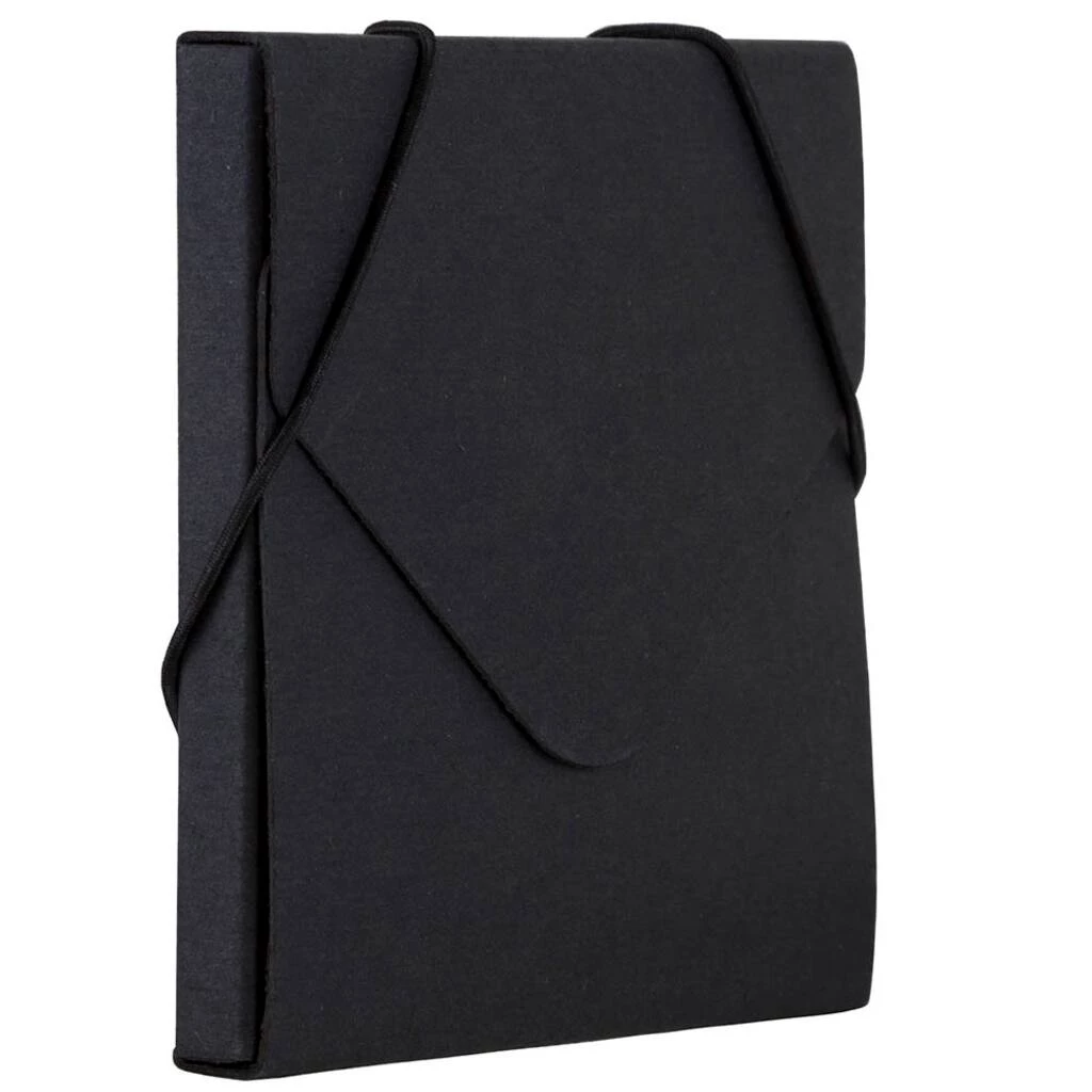 This JAM Paper portfolio case is made out of smooth, earth friendly, 100% recycled chipboard and features a versatile, professional jet black color. It also features a long v-flap opening those folds over the front when closed. To ensure that this portfolio stays closed, there are two black elastic bands attached to the back on either end that stretch up over the top corners.