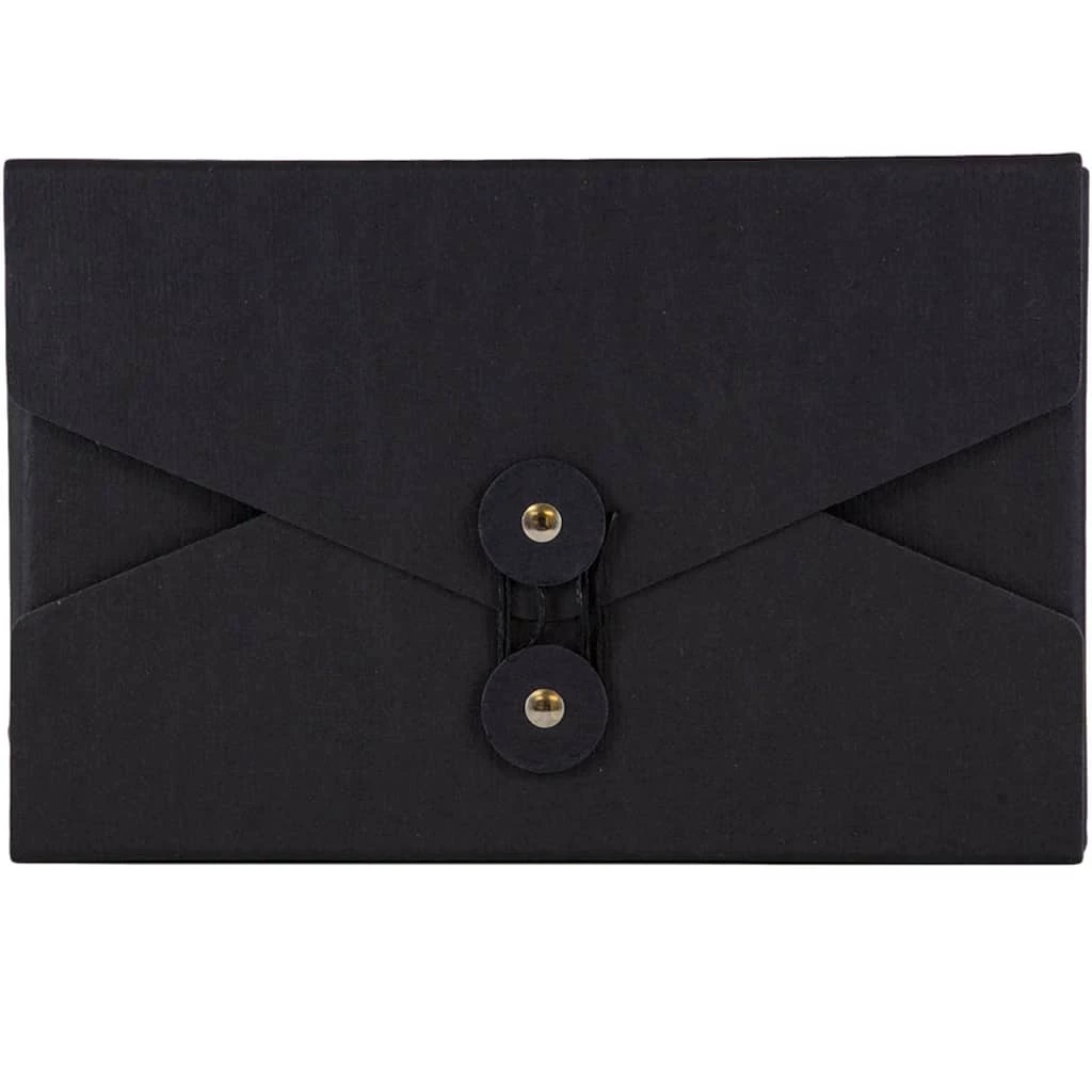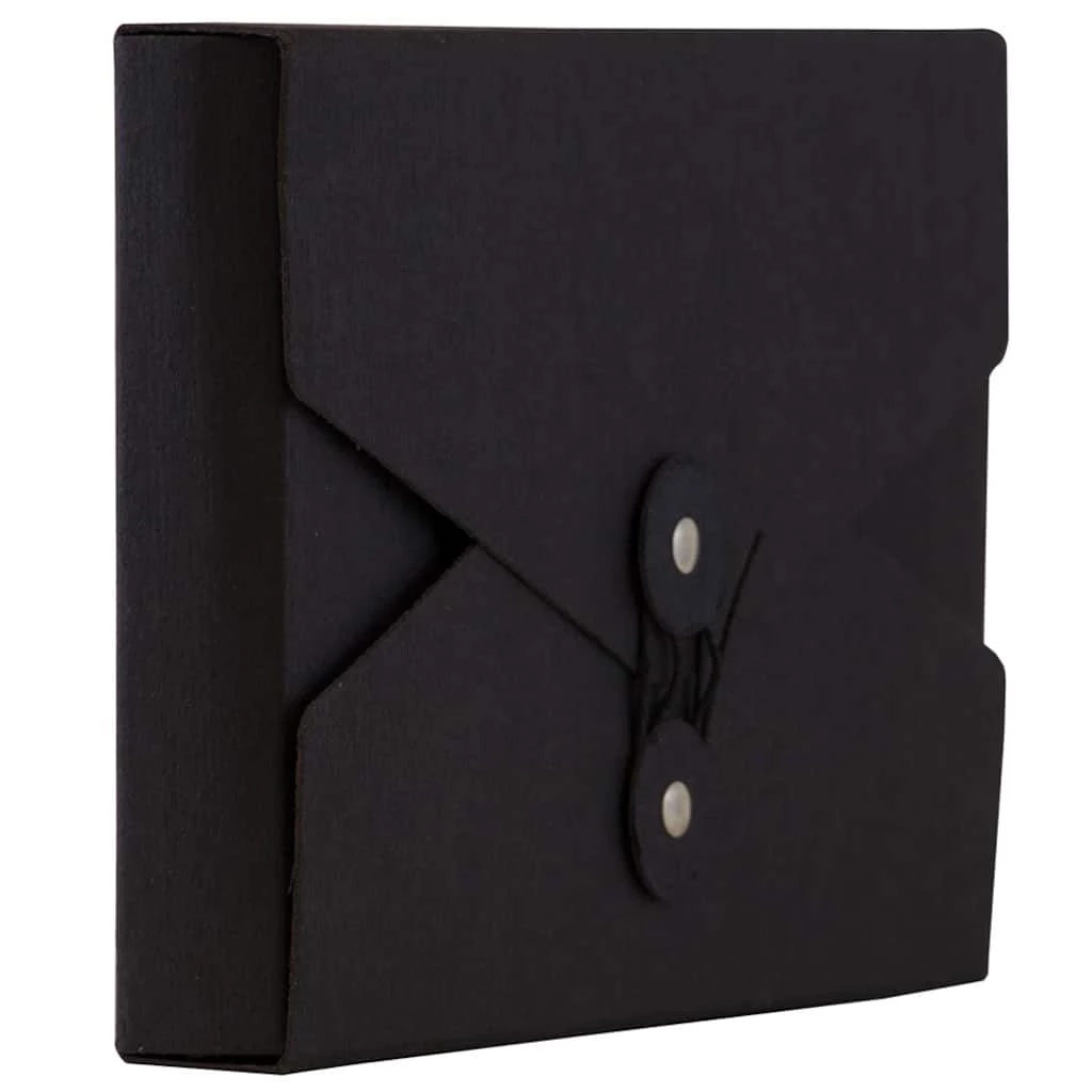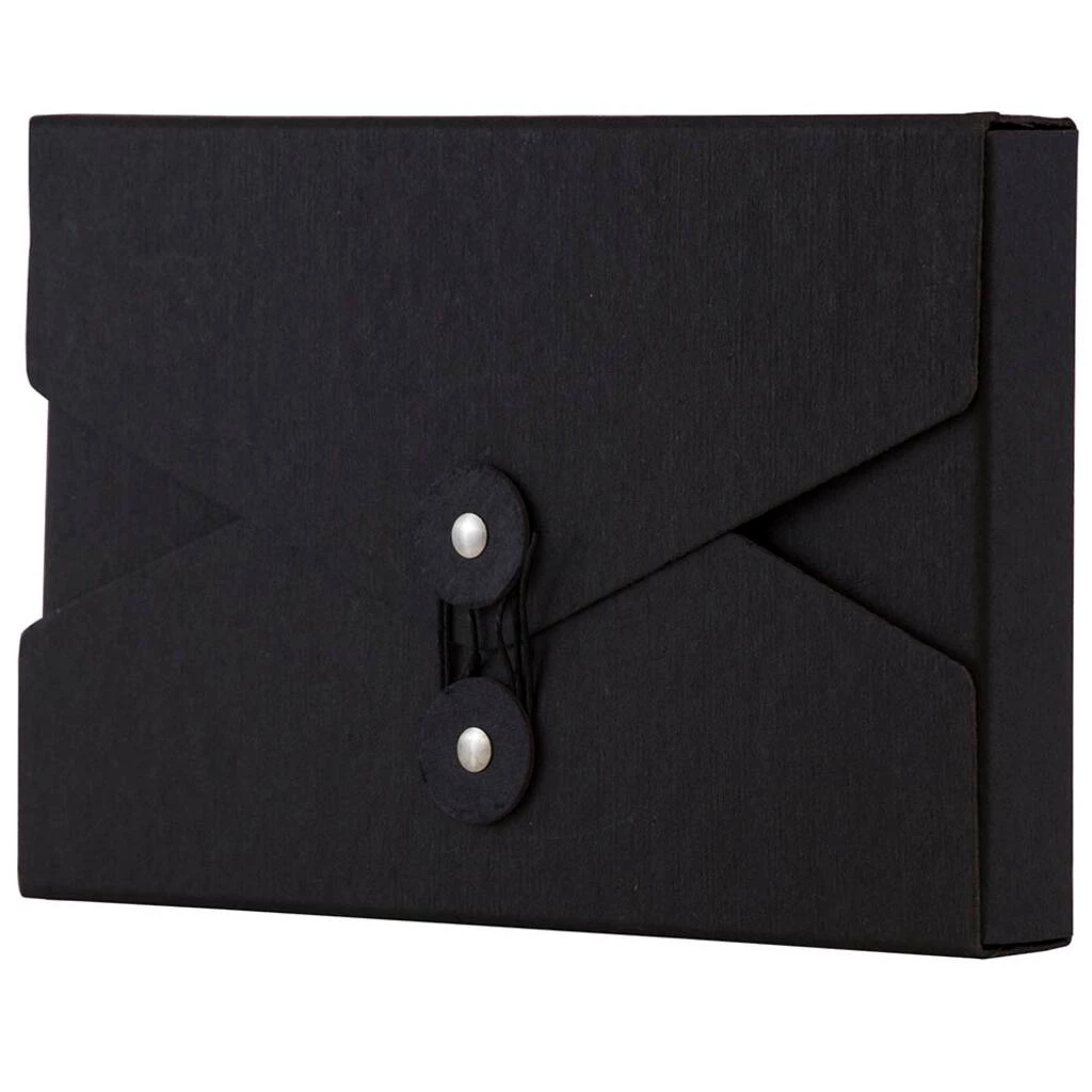This individually sold portfolio case measures 5.5 x 8.5 x 1 inches (VHS video size) and is made out of smooth, durable, earth friendly, 100% recycled chipboard. This portfolio features a black color the matches with everything. It also features a v-flap opening and a two button and string tie closure. Each button of this closure is also black with a shiny silver metal middle. The string that wraps around these buttons also matches the case.