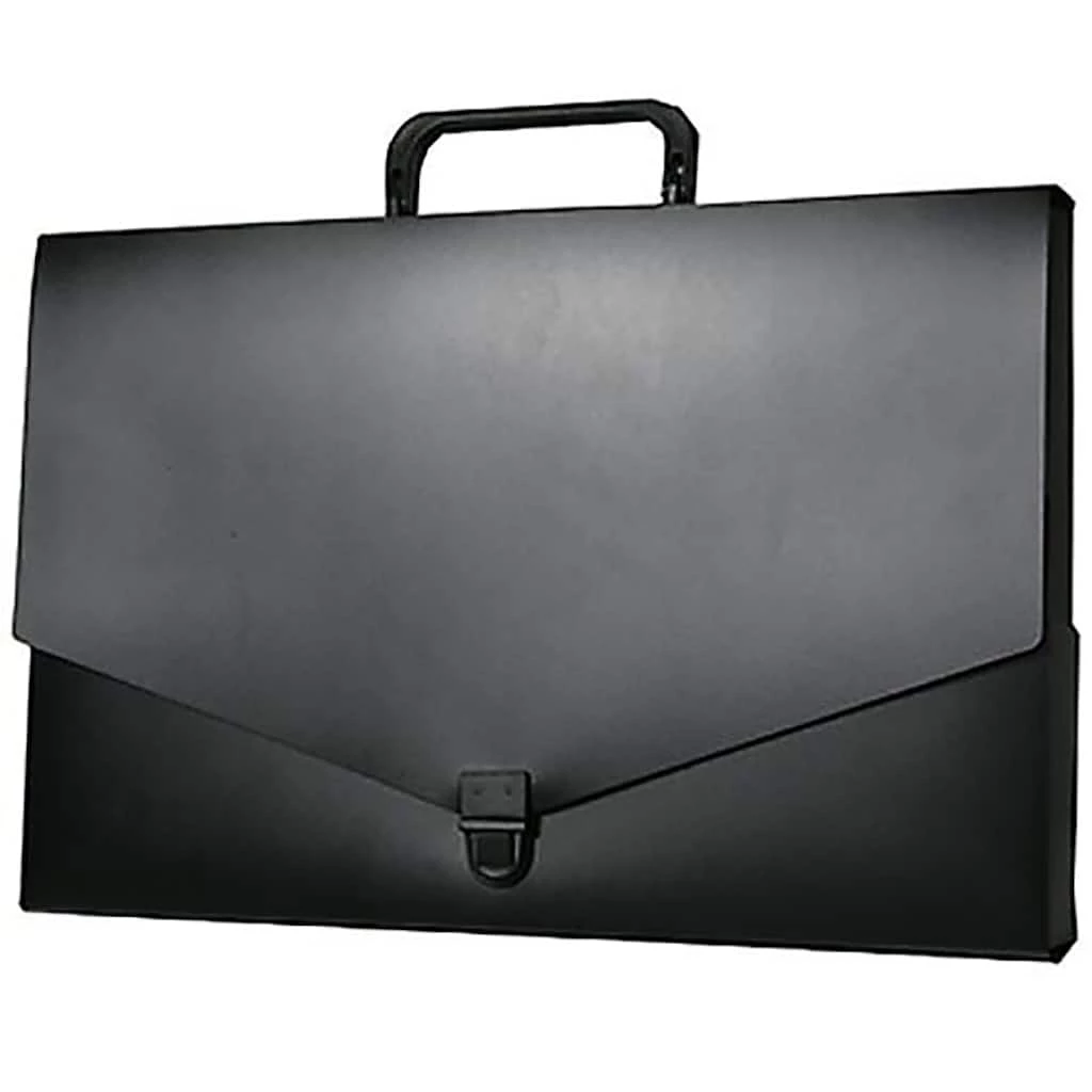 The JAM Paper Black Plastic Portfolio Briefcase with Handle is the ideal size for enclosing multiple standard or legal sized documents and other office supplies. This case is sold individually and features a sleek and professional jet black color. Made out of durable, smooth, poly plastic, this case will keep any items that you store within it protected from dirt and damage. To make carrying simple and easy, this portfolio has a black plastic handle on the top. This briefcase opens with a long v-flap that overlaps most of the front panel when it is closed. It closes with a reliable black plastic buckle closure.