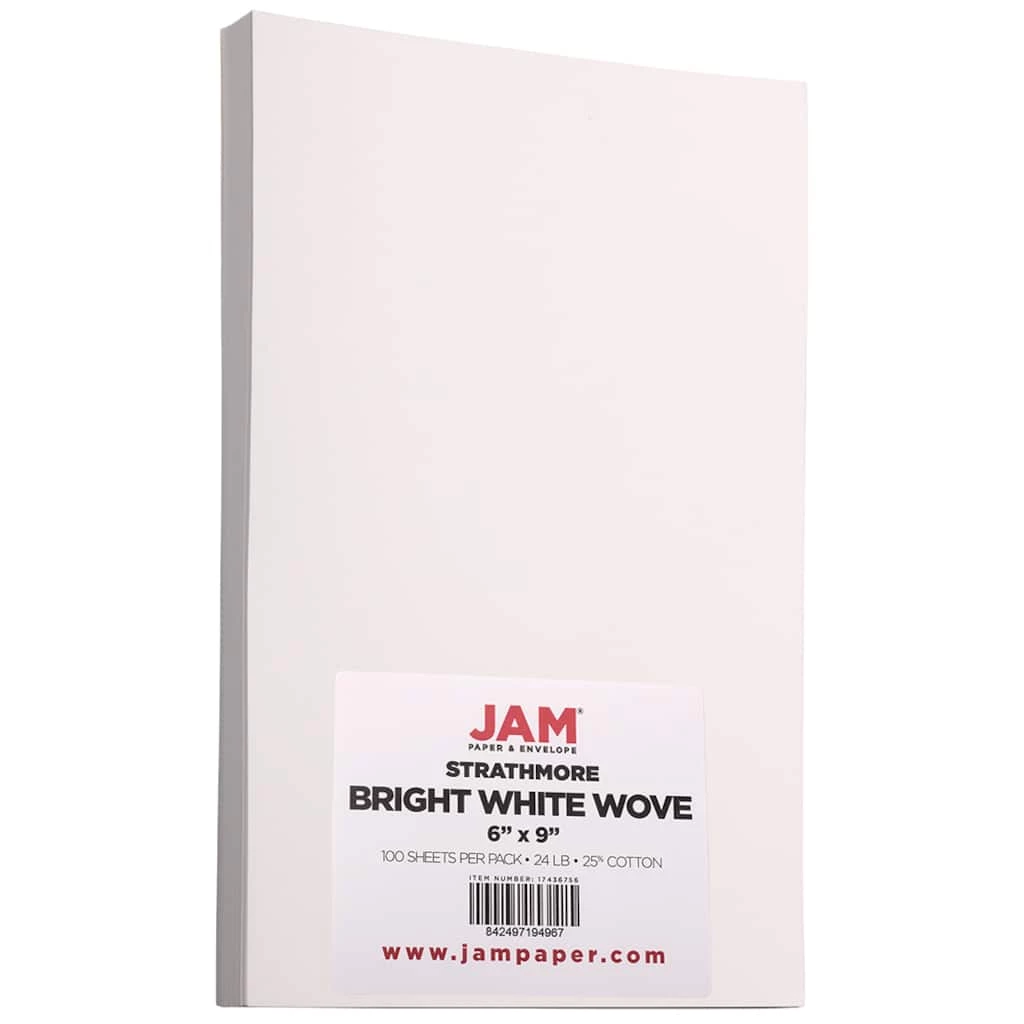 If you’re a paper connoisseur, you know that not all white paper is the same. Perhaps it is your search for specialty paper that has led you to JAM Paper Bright White Wove Strathmore Paper. Far superior to ordinary white paper, this high quality, 24 lb., natural white paper is watermarked and made with 25% cotton! It has a luxurious laid texture for a quality you can feel. It is also acid free and compatible with both ink jet and laser printers. This pack contains total of 100 sheets of 6″ x 9″ paper. Use it in your office or home to create stunning and professional documents for business or personal purposes.