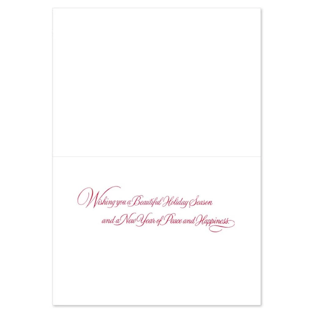 This card set is a perfect way to send joy and greetings to family, friends, and loved ones this holiday season! Inside message reads: “Wishing you a beautiful holiday season and a new year of peace and happiness.” Any kind of message you decide to send will bring joy and smiles to everyone involved. Having a great card to send to all of your family and friends, coworkers and acquaintances, will give you a special advantage during the Christmas season.