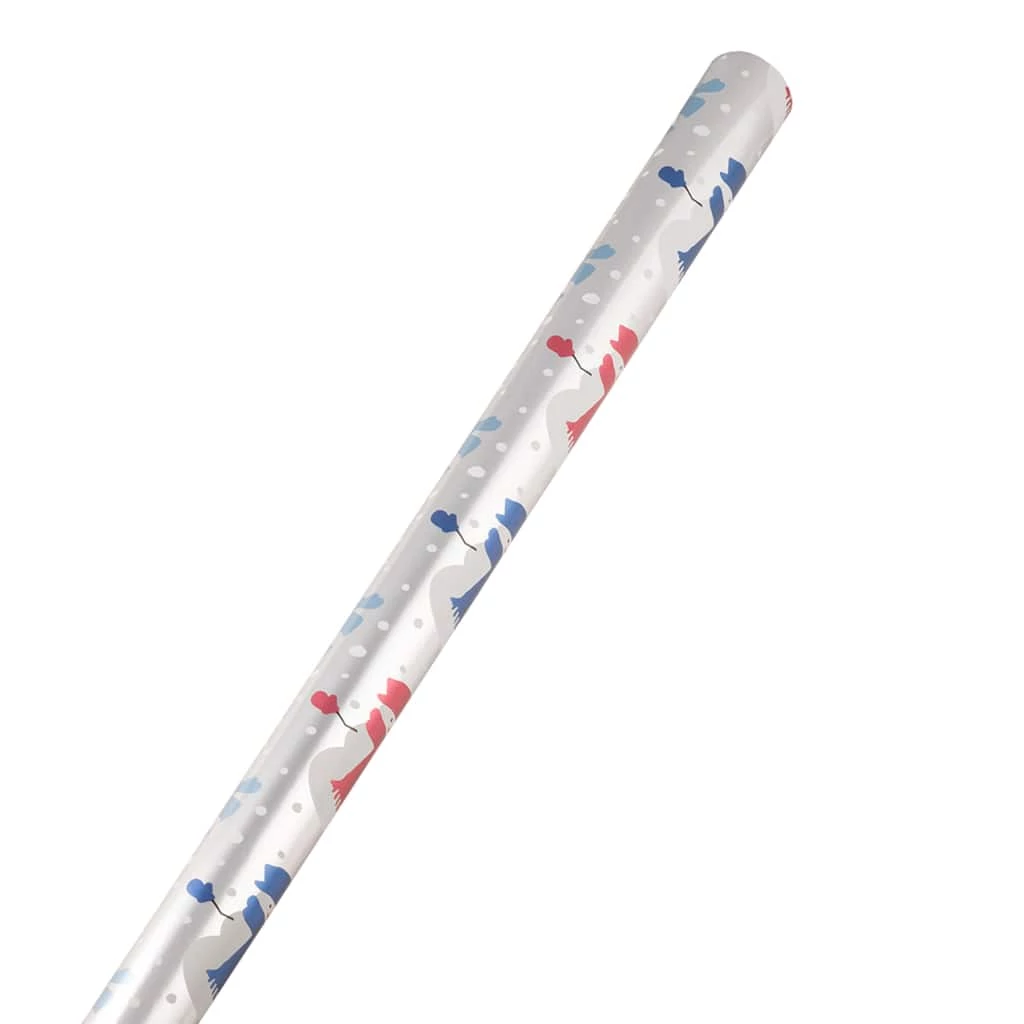 This smooth, high quality wrapping paper features a metallic silver color and a pattern of round white snowflakes and white snowmen in hats and scarves. These hats and scarves are light blue, dark blue, and red. This adorable holiday wrapping paper is great for making the gifts that you’ll be wrapping this winter season look fun and festive! With its shiny silver color and colorful pattern, it is certain to help gifts to stand out on the gift table or under the tree!