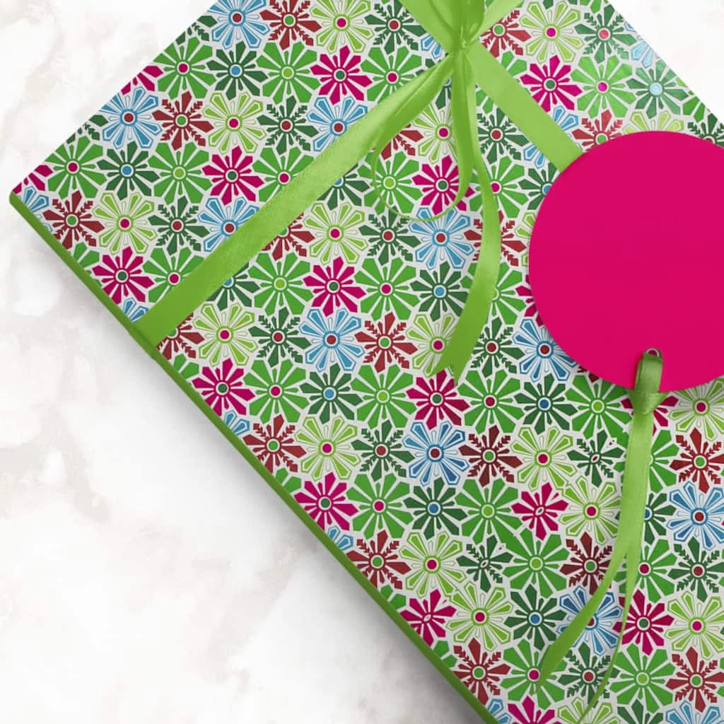 This wrapping paper features a bright and colorful pattern of snowflake-like flowers. These flowers are green, light green, dark green, blue, burgundy, and fuchsia. This paper has a shiny finish that will stand out and beautifully reflect the lights on your Christmas tree. This unique wrapping paper is perfect for all of the people on your list who appreciate fun and non-traditional styles and decoration!