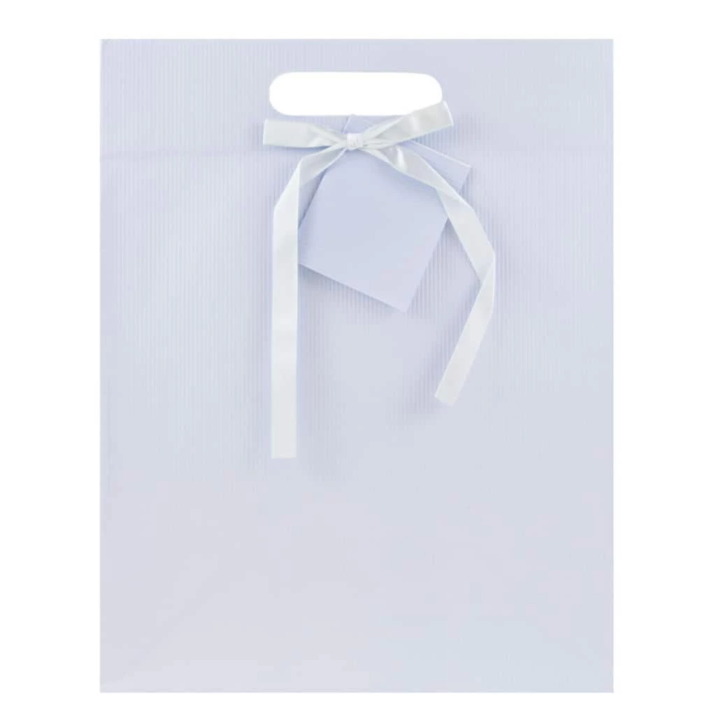 JAM Paper Medium Light Blue Pinstripe Gift Bags, 3ct. are the perfect match to carry that gift from the heart. Each one features a light blue color with a fine pinstripe pattern and texture. For easy carrying, these gift bags feature two sturdy die-cut handles with rounded edges. On the front of each bag, there is a singular white ribbon bow and a small booklet gift tag that matches the bag provided so that you may add the names and messages of your choice! Use them for easy and flawless gift packaging for that next birthday, wedding, baby shower, or other celebration!Β