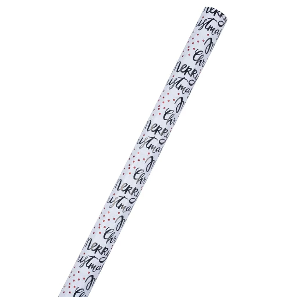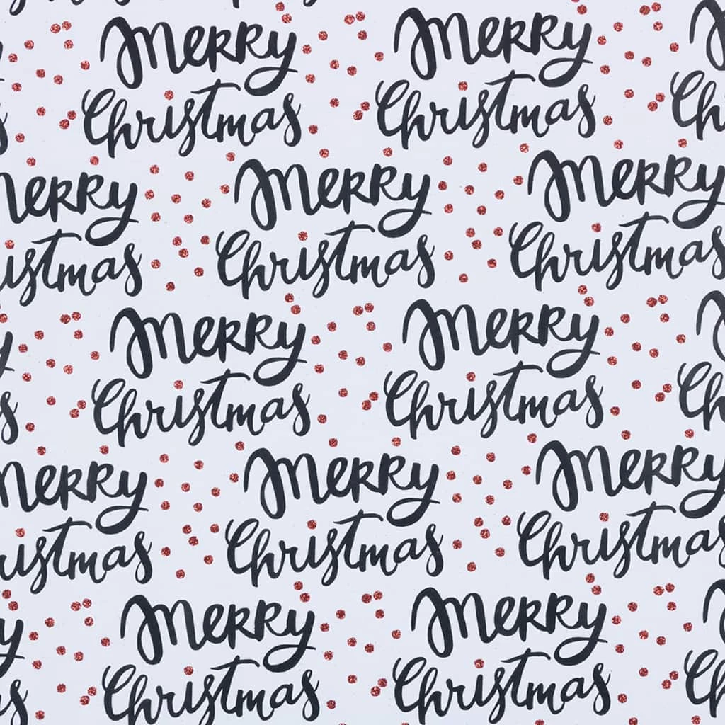 This Merry Christmas script wrap warmly addresses loved ones with a “Merry Christmas” greeting written in stunning black script surrounded by red polka dots made of actual glitter. Displayed on a clean white background, the three-color combination and glitter elements create a delightful wrap both you and your loved ones will adore!