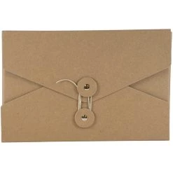 This individually sold portfolio case measures 5.5 x 8.5 x 1 inches (VHS video size) and is made out of smooth, durable, earth friendly, 100% recycled chipboard. This portfolio features a natural brown kraft color the matches with everything. It also features a v-flap opening and a two button and string tie closure. Each button of this closure is also light brown with a shiny silver metal middle. The string that wraps around these buttons also matches the case.