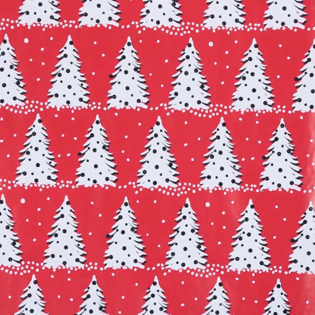 This painted Christmas trees design wrapping paper dresses up your packages in beautifully painted white Christmas trees adorned with black ornaments made of actual glitter! A bold yet traditional red background complements the charming tree design. From children to adults, this wrap is a great fit for all ages and is certain to sparkle under the tree lights!