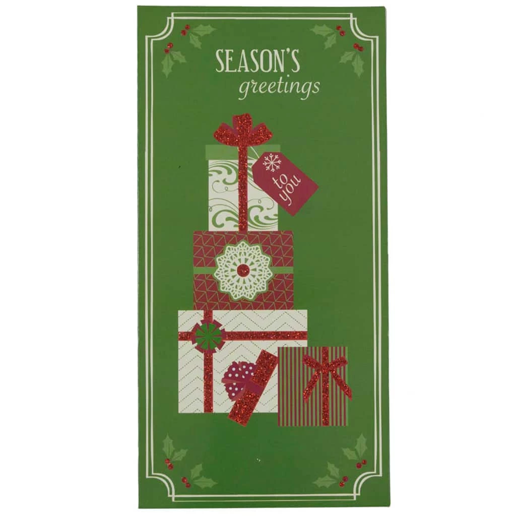 Looking for the right card to give away money or a gift card in this Christmas? These cards are perfect for mailing or for giving in person. The front of each card is a festive green color and features a stack of wrapped, red, green, and white presents inside of a white, holly ornamented frame. A tag that reads, “To You” hangs off of the top present. Above the pile, “Season’s Greetings” is written in white letters. When open, each of these cards is blank on the left side and on the right side, includes a slot that is designed to hold cash, checks, and gift cards. The outer facing part of this slot reads, “In this loveliest of seasons, may you find many reasons for happiness”. A sprig of red holly appears below this and a red frame surrounds.