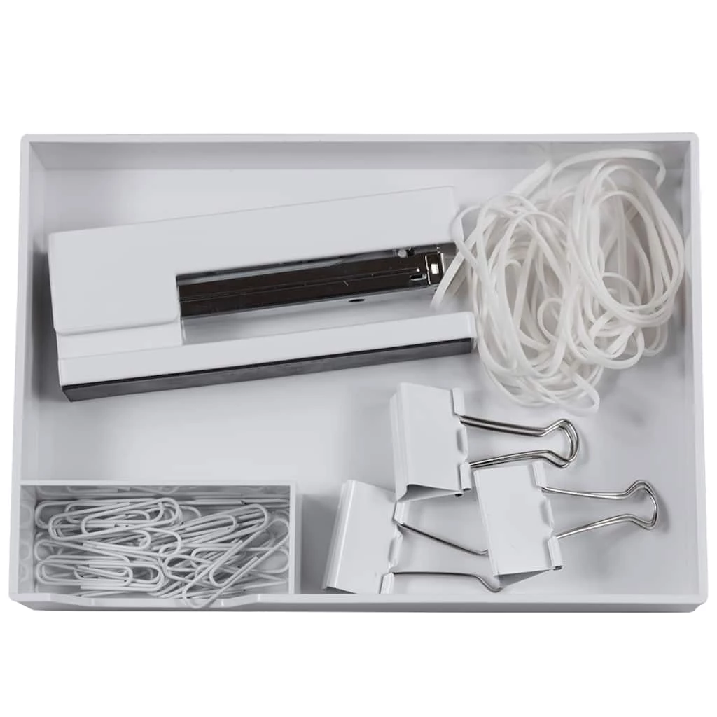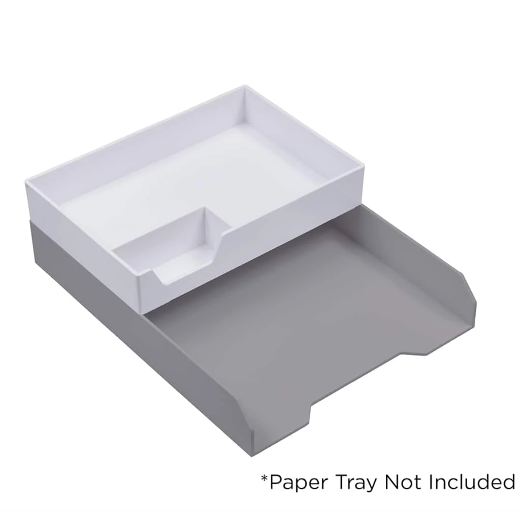 Take control of your workspace with this stackable office supply tray from JAM Paper! This white half desk tray increases efficiency by keeping office supplies in one organized place while adding a sleek, modern look to your desk. For optimum efficiency, buy with full paper trays and stack them high – you’ll never lose track of significant documents or your favorite desk supplies! From the home to the office, this tray is certain to boost organization and efficiency.